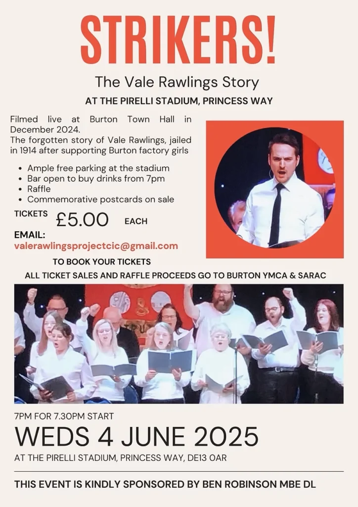 Our one-off performance of Strikers! – The Vale Rawlings Story, at Burton Town Hall last December was filmed live and we will be holding a charity film night to screen it at the Pirelli Stadium on Wednesday June 4, 2025.
