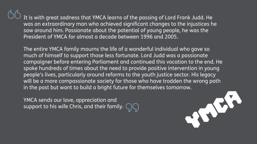 It is with great sadness that YMCA learns of the passing of Lord Frank Judd.